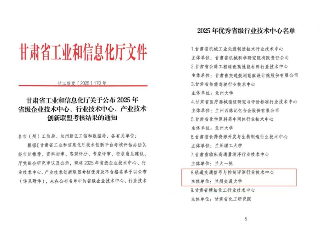 近日,甘肃省工业和信息化厅正式公布了2025年省级行业技术中心的考核结果(甘工信发〔2025〕170号),“甘肃省轨道交通信号与控制评测行业技术中心”(以下简称“中心”)获评优秀省级行业技术中心称号。该荣誉标志着中心在轨道交通领域的核心技术实力获得高度认可。