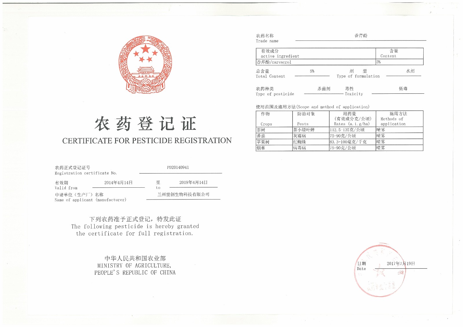 图1.1农药登记证书