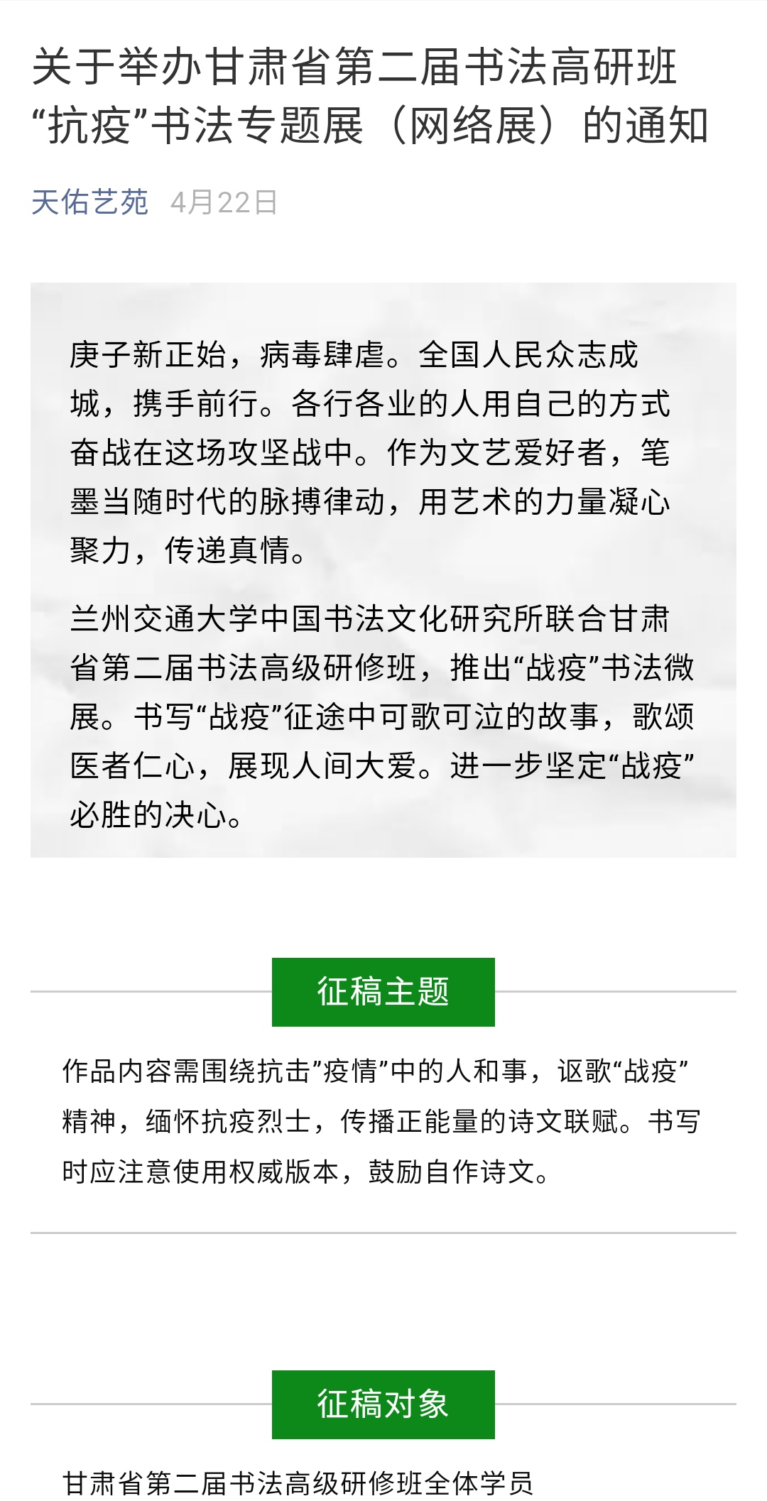 2020年新型冠状病毒肺炎疫情牵动着全国人民的心。近日,为贯彻落实习近平总书记的重要指示精神,根据兰州交通大学党组织关于做好抗击疫情文艺精品创作工作的统一部署,研究院中国书法文化研究所依托甘肃第二届书法高级研修班,组织举办了“战疫”书法网络展,为疫情防控阻击战增加一份力量!